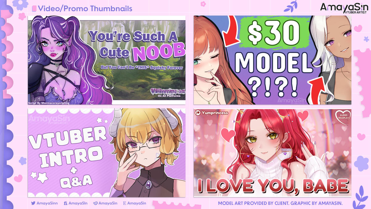 I offer commissions for a wide variety of graphics. Most commonly I work with Streamers and Vtubers. Below is a list of some of the services I offer through VGen.