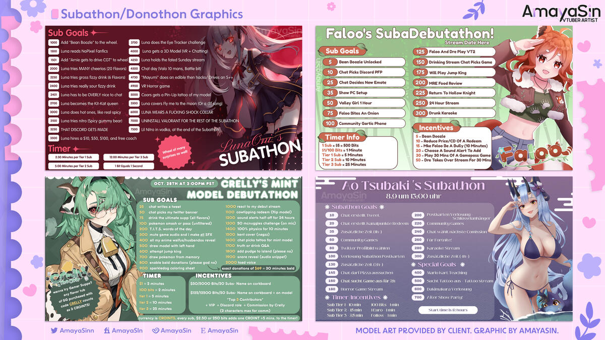 I offer commissions for a wide variety of graphics. Most commonly I work with Streamers and Vtubers. Below is a list of some of the services I offer through VGen.